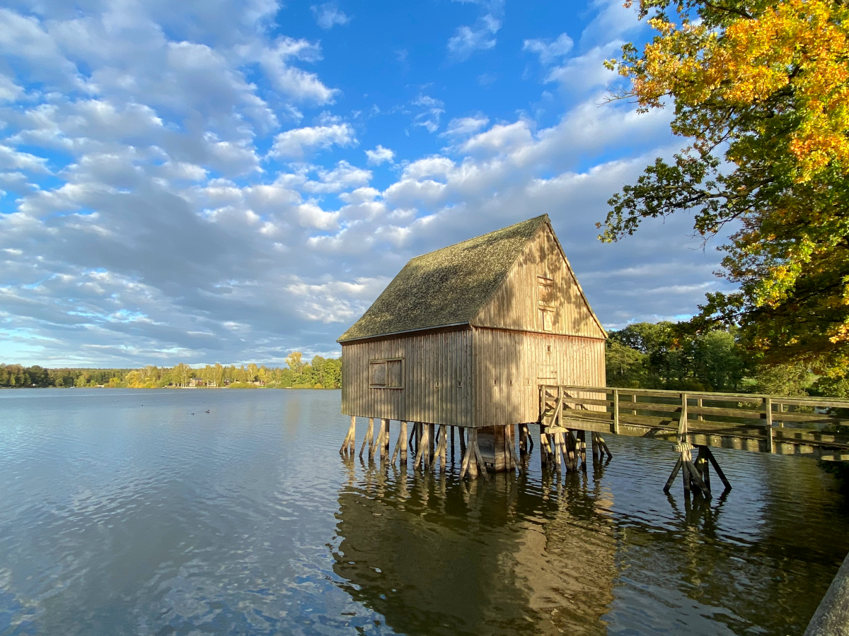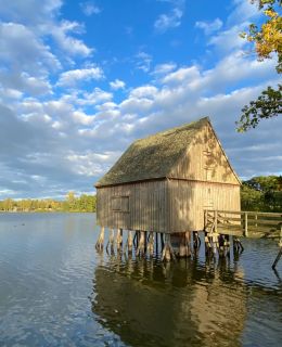 Unsere Jugendherberge lag dierkt am schönen Hausteich. Das Pfahlhaus in der Nähe lockte zu einem Besuch, verbunden mit einem Spaziergang in der wassergeprägten Landschaft.